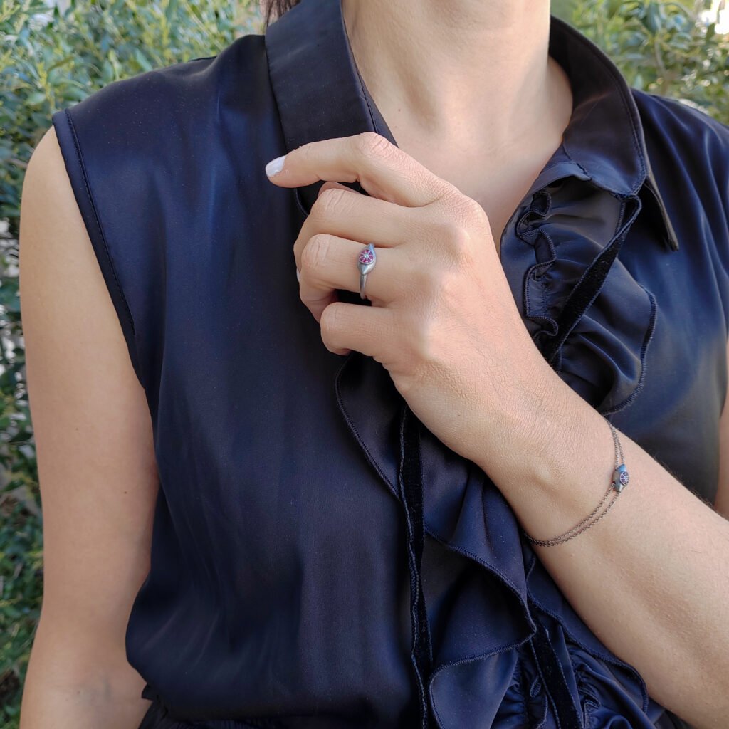 Ασημένιο δαχτυλίδι σε σατινέ φινίρισμα με ζιργκόν, διατίθεται σε ασήμι με μαύρη επιροδίωση και κόκκινα ζιργκόν.