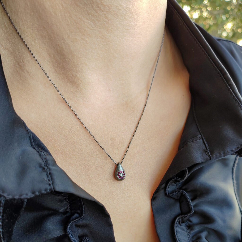 Ασημένιο μενταγιόν σε σατινέ φινίρισμα και ζιργκόν, διατίθεται σε ασήμι με μαύρη επιροδίωση και κόκκινο ζιργκόν.