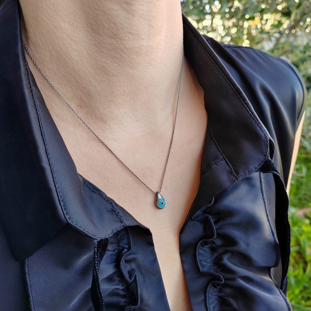 Ασημένιο μενταγιόν σε σατινέ φινίρισμα και ζιργκόν, διατίθεται σε ασήμι με μαύρη επιροδίωση και τυρκουάζ ζιργκόν.