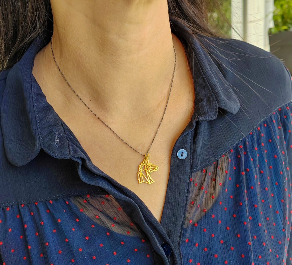 Χειροποίητο κομψό χρυσό μενταγιόν 9 καρατίων περασμένο σε ασημένια αλυσίδα με μαύρη επιροδίωση.